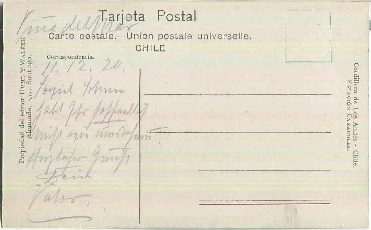 Cordillera de los Andes - Estacion Caracoles - Propriedad de Hume y Wagner Ahumada - Rückseite beschrieben 1920 (E89593) *