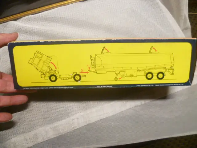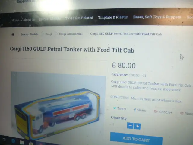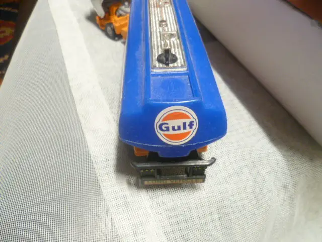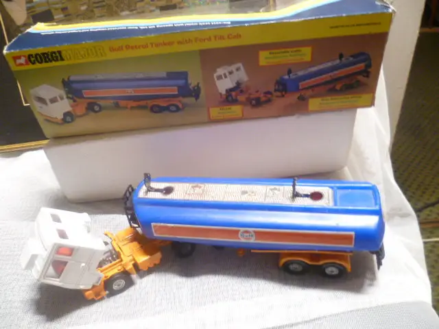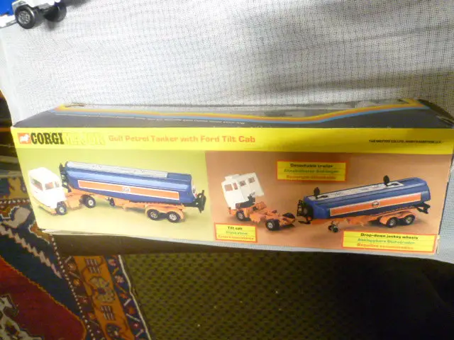 Corgi1160GULF Petrol Tanker with Ford Tilt Cab white cab,orange blue plastic tanker body with Gulf decals to sies and rear, ex shop stock