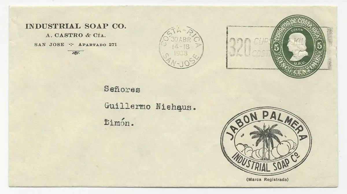 Costa Rica 1938, gebr. 5 C. Ganzsache Brief m. Reklame Zudruck Jabon Palmera