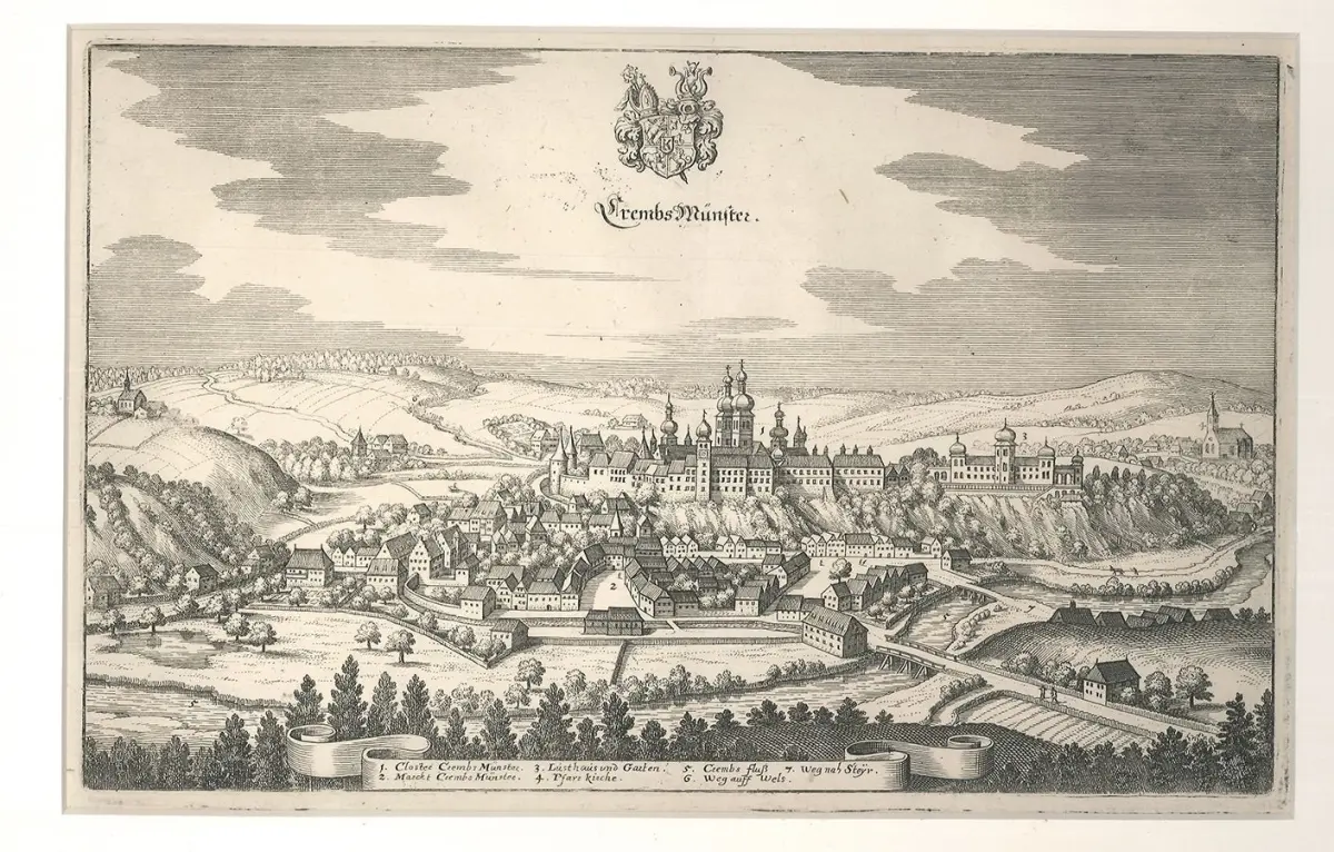 Bemerkungen: Nebehay-W. 407, 43 - Ansicht von Kremsmünster. Aus: Topographia Provinciarum Austriacarum. Beschreibung und Abbildung der fürnembsten Stätt und Plätz in den Österreichischen Landen.