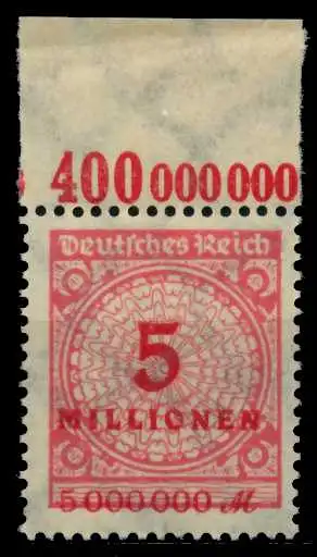 5 Mio Mark Wert aus der Inflationsausgabe Kreis mit Rosetten- (Korbdeckel) Muster, Oberrandplattentype A, im Oberrandbereich etwas knittrig