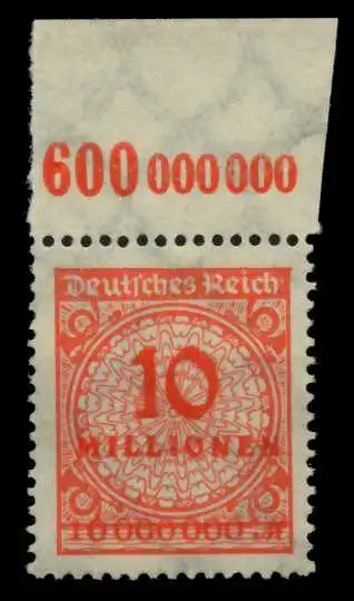 10 Mio Mark Wert aus der Inflationsausgabe Kreis mit Rosetten- (Korbdeckel) Muster, Haftspuren, Oberrandplattentype A