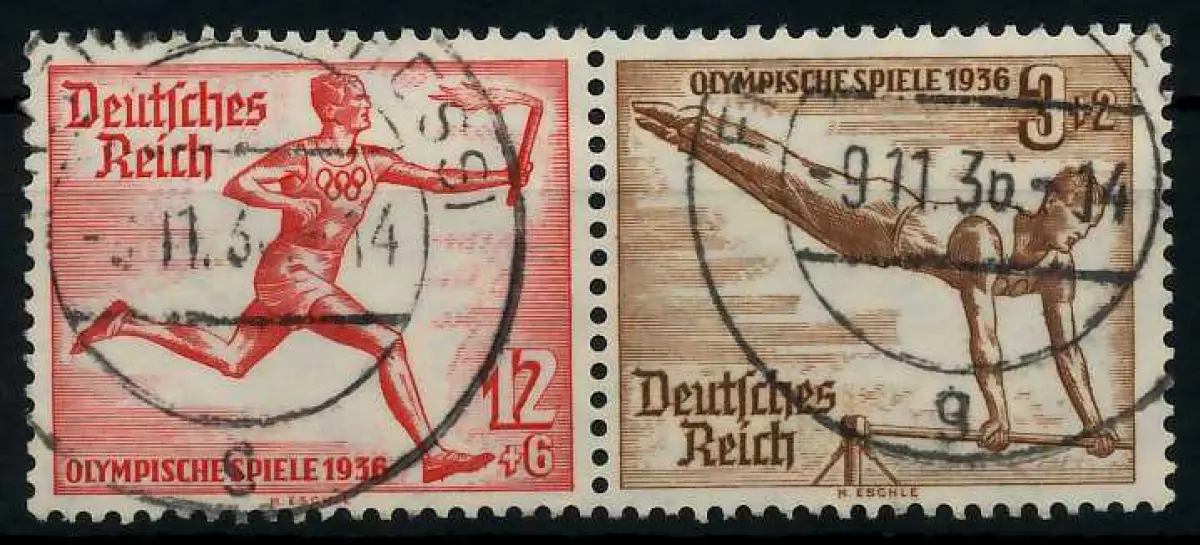 12 + 3 Zusammendruck aus der Ausgabe Olympiade 1936 (MichelNr.: 101090, 613, 609)