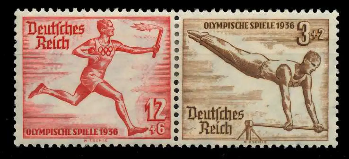 12 + 3 Zusammendruck aus der Ausgabe Olympiade 1936 (MichelNr.: 101090, 613, 609)