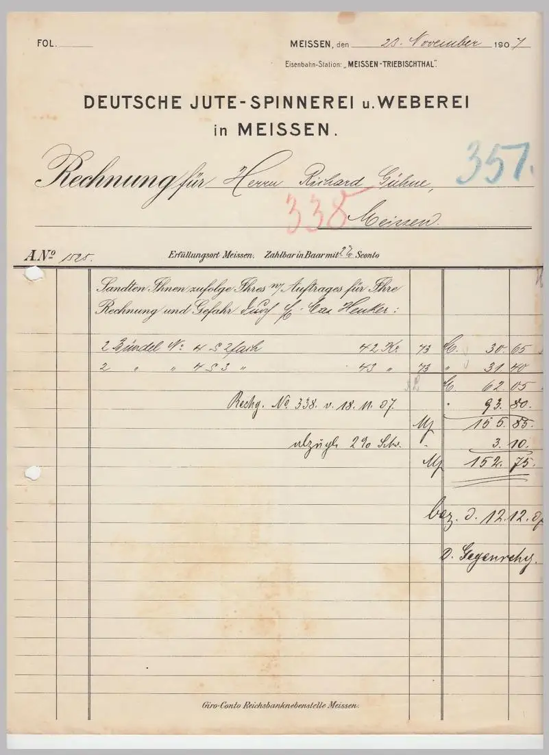- (D124) Rechnung Fa. Deutsche Jute-Spinnerei u. Weberei Meissen 1907