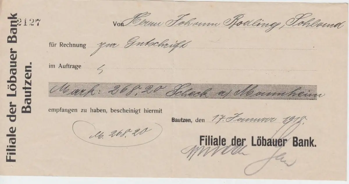 - (D577) Quittung der Filiale der Löbauer Bank, Bautzen 1918