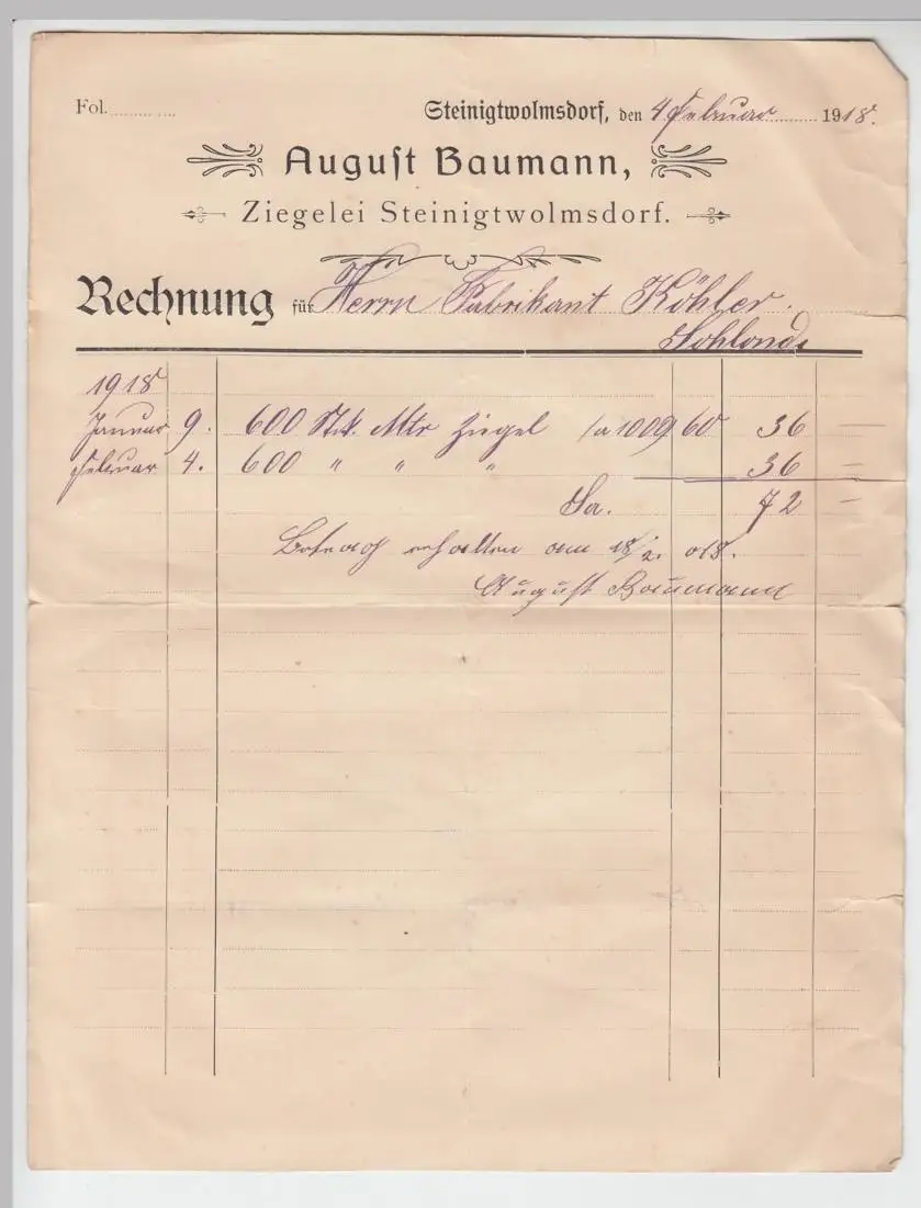 - (D592) Rechnung von Tiegeler August Baumann, Steinigtwolmsdorf 1918