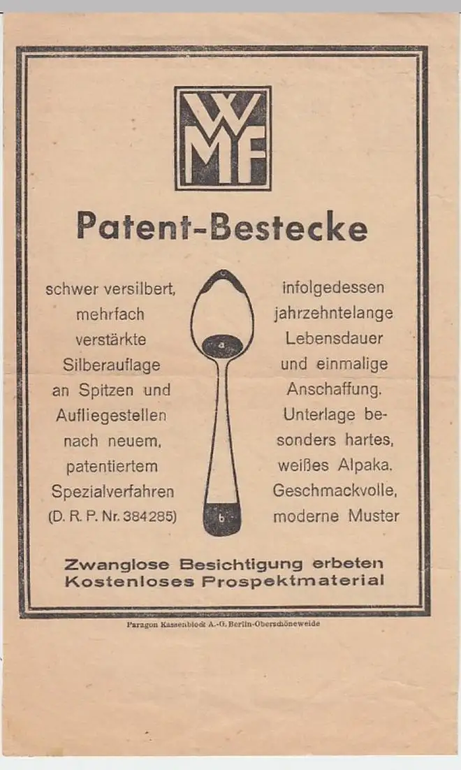 - Zustand: Württembergische Metallwarenfabrik, Niederlage Stuttgart, Rücks. Werbung Patent-Besteck, Größe 120 x 190 mm, gefaltet
