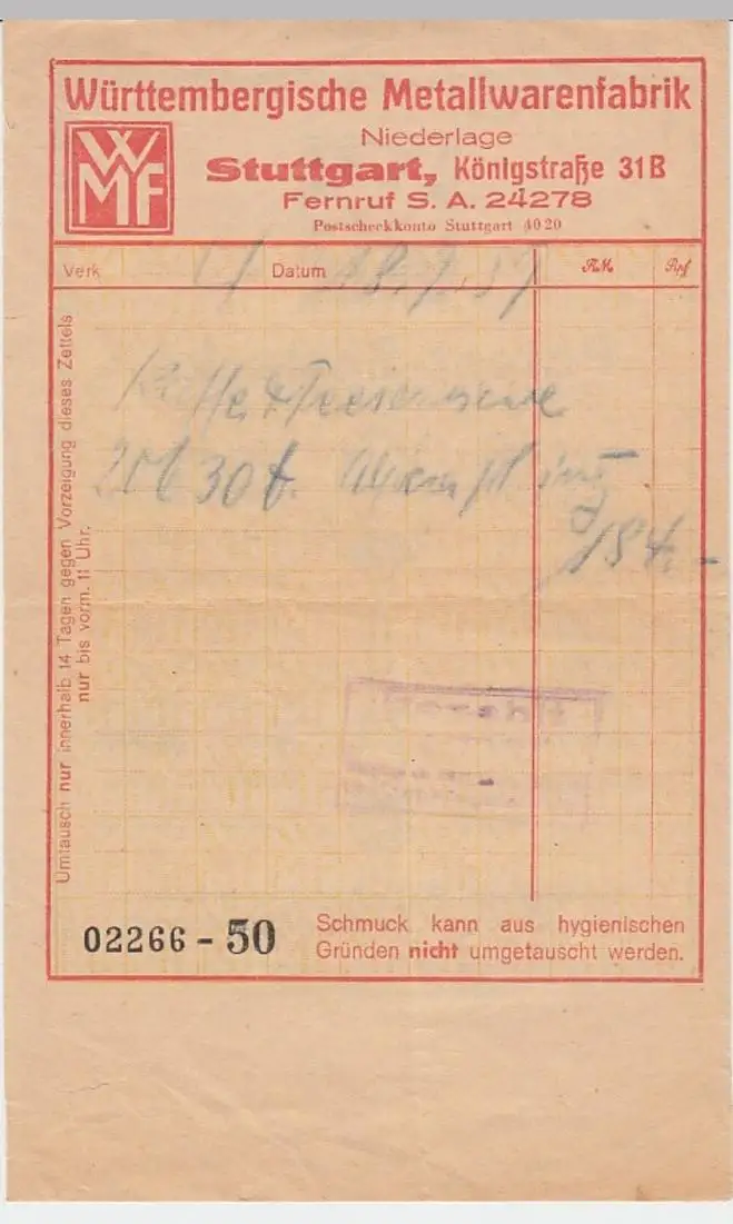 - (D82) Quittung WMF Stuttgart für ein Kaffee- Teeservice 1939