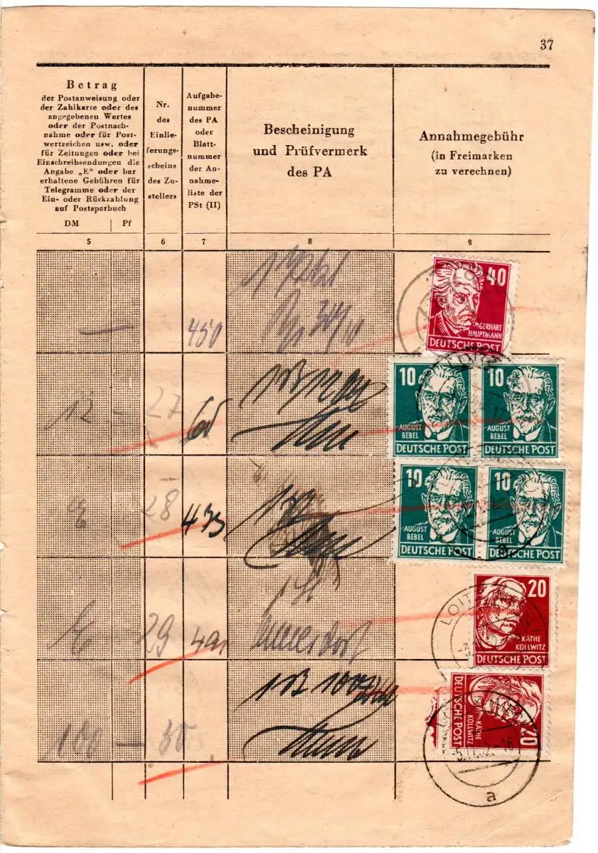 DDR 1952, 7 Marken f. Gebühren auf Seite eines Posteinlieferungsbuches v. Loitz