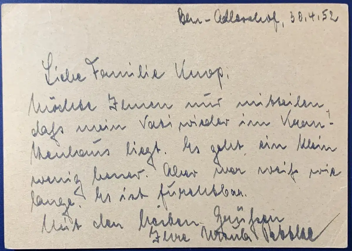 Ganzsache, DDR, Postkarte, Mi.Nr. P41a, gelaufen mit Poststempel vom 30.04.1952 von Berlin-Adlershof nach Berlin-Wilmersdorf.