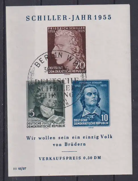 DDR Schiller-Jahr 1955 Blockausgabe MiNo. Bl. 12 PF IV : J von Jahr vorgezogen SSt Berlin W 8
