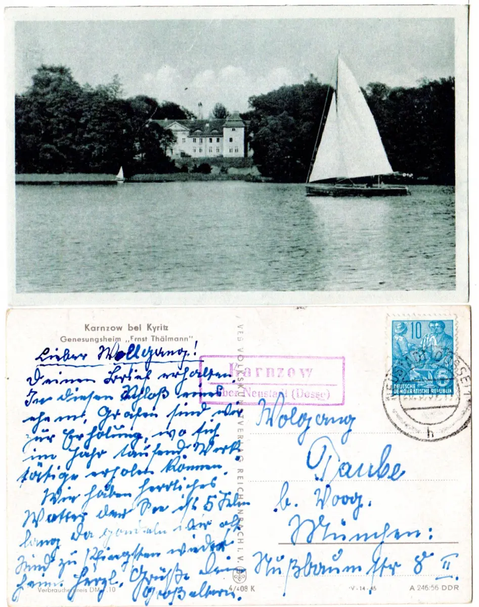 DDR 1957, Landpost Stpl. KARNZOW über Neustadt (Dosse) auf sw-AK m. 10 Pf.