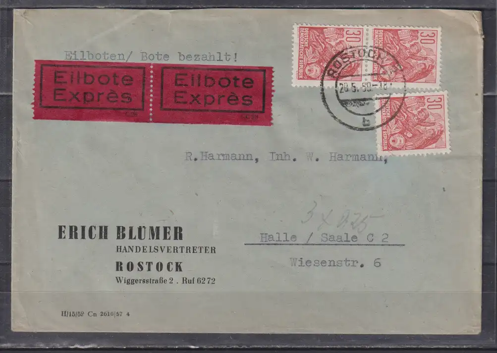 DDR Eilbotenbrief Rostock/28.5.59 mit 3x 416 nach Halle
