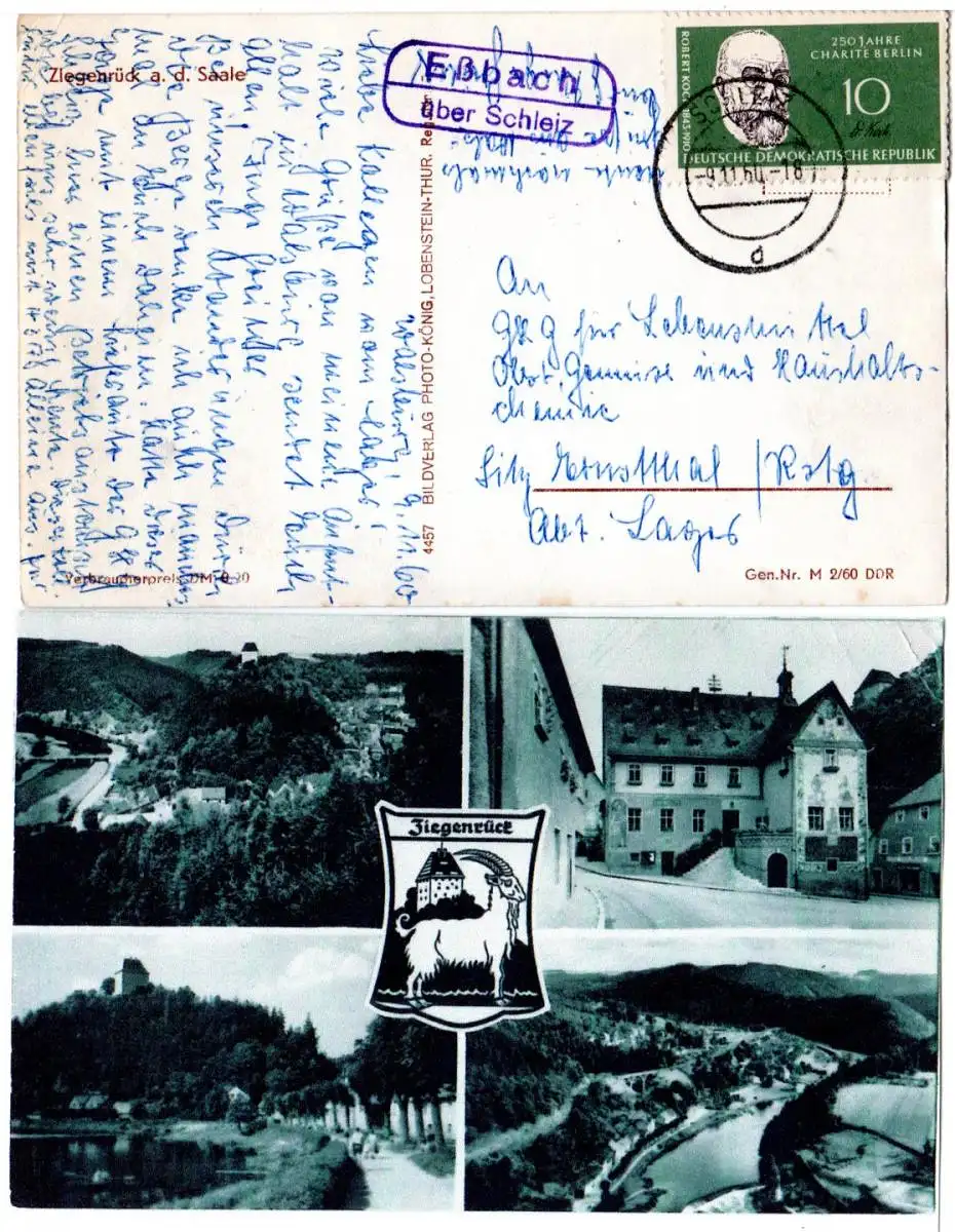 DDR 1960, Landpoststpl. ESSBACH über Schleiz auf sw-AK m. 10 Pf.