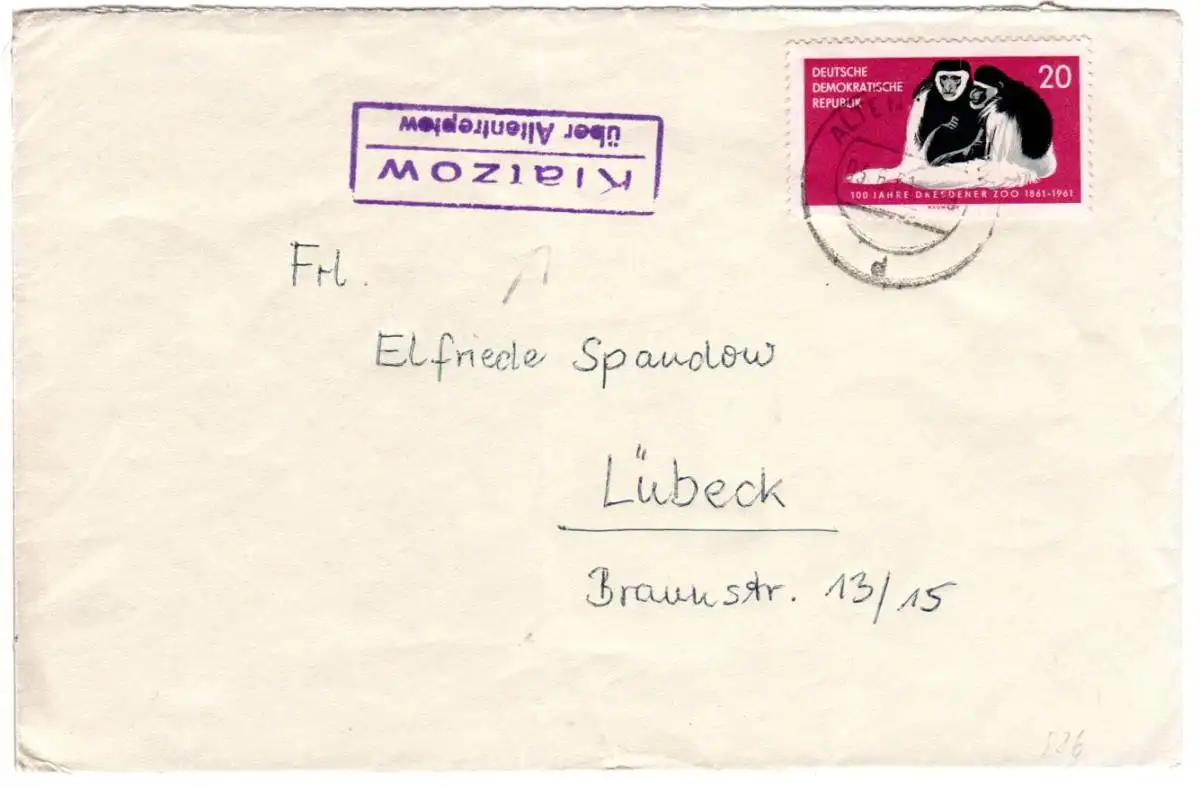 DDR 1961, Landpost Stpl. KLATZOW über Altentreptow auf Brief m. 20 Pf.