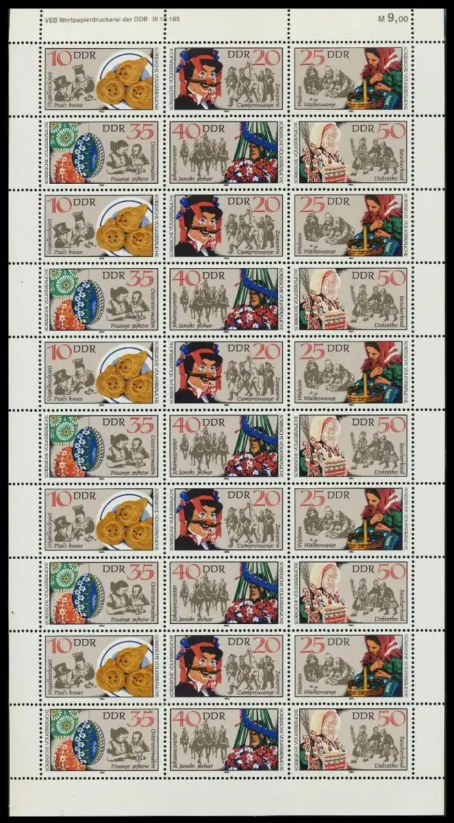 Ausgabe Sorbische Volksbräuche im kpl. Zusammendruckbogen (MichelNr.: 2716-21, 2716, 2717, 2718, 2719, 2720, 2721)