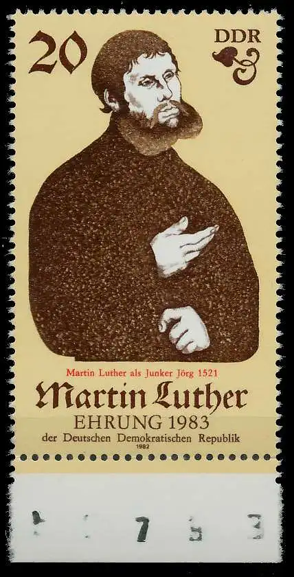 20 Pfg Wert aus der Ausgabe Martin Luther, aus dem Kleinbogen, Unterrand mit Bogennummer