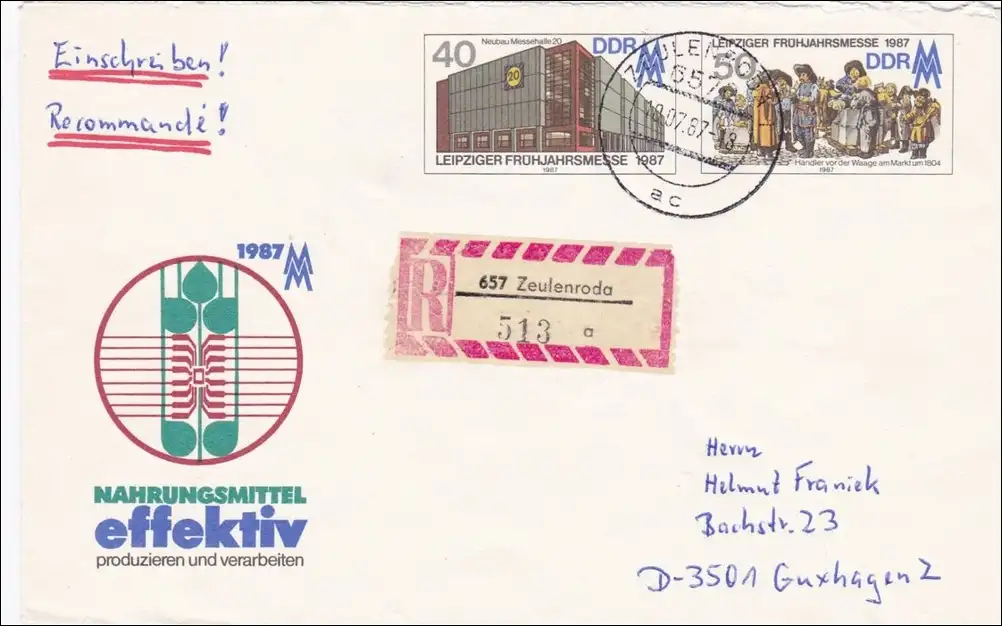 DDR: 1987: Einischreiben aus Zeulenroda nach Guxhagen - Ganzsache U6