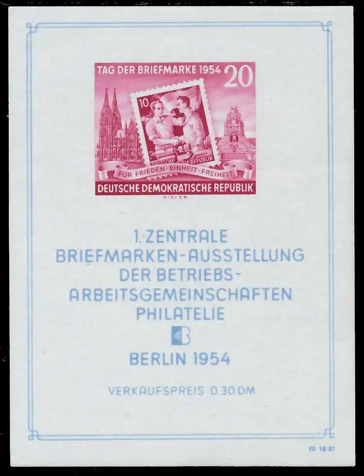 Blockausgabe 20 Pfg Wert Tag der Briefmarke 1954, im Blockrand befindet sich ein Gummiklecks, nur als Marke bewertet