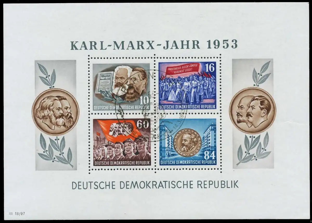 Blockausgabe Karl Marx Jahr (gezähnt), Sonderstempel, im Blockrand rechts Papierknitter
