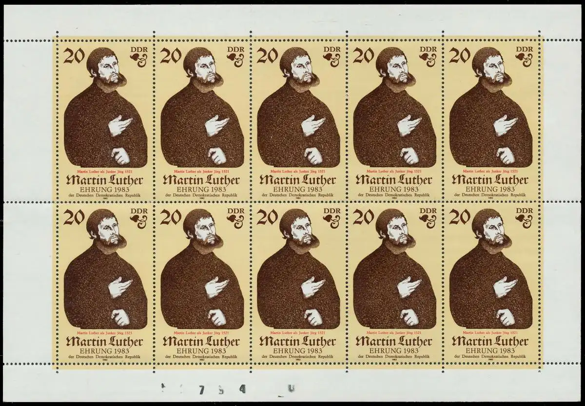 20 Pfg Wert aus der Ausgabe Martin Luther im Kleinbogen zu 10 Marken mit Plattenfehler III (Loch im rechten Abstrich vom M von Martin)
