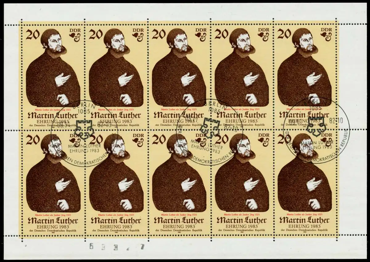 20 Pfg Wert aus der Ausgabe Martin Luther im Kleinbogen zu 10 Marken mit Plattenfehler IV (c statt e in Junker)
