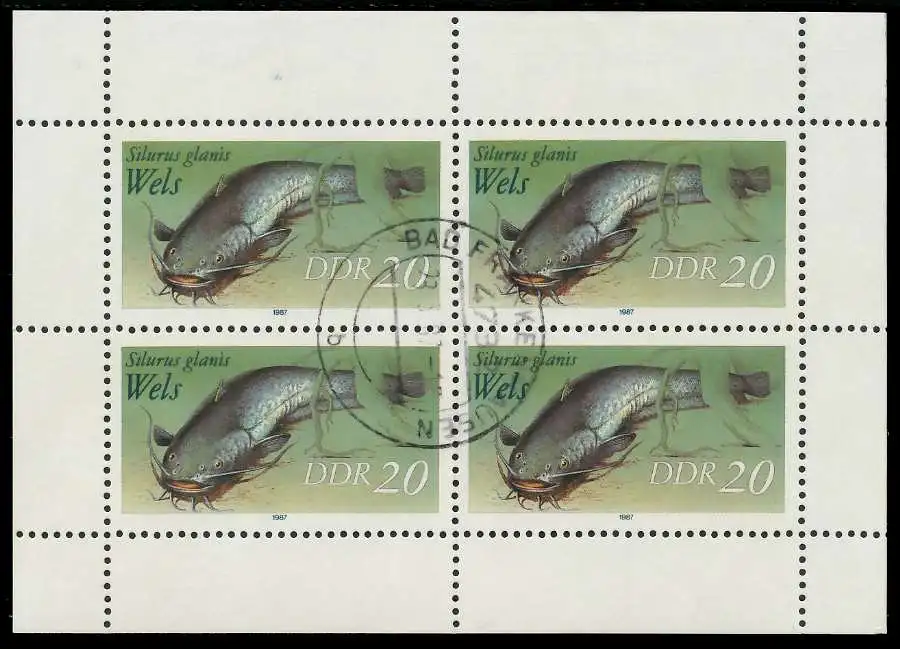 20 Pfg Wert aus der Ausgabe Fische - Wels, im Kleinbogen zu 4 Marken, aus dem Bedarf, abgelöst, etwas wellig