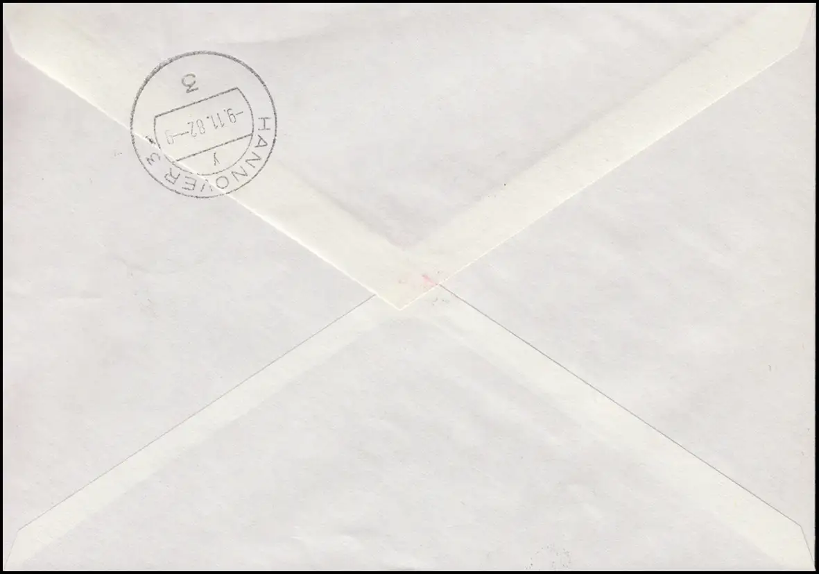 mit Messe-Vignette, Ankunftsstempel HANNOVER 3 y 9.11.82