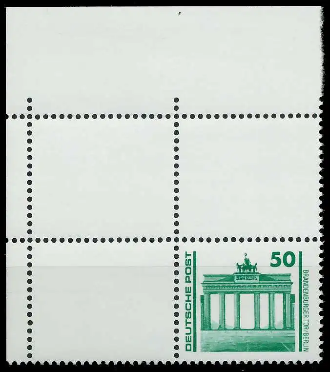 50 Pfg Wert aus der Freimarkenausgabe Bauwerke und Denkmäler, Ecke oben links aus dem Heftchenbogen mit allen Leerfeldern