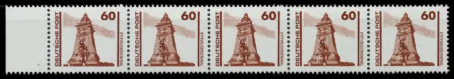 60 Pfg Wert aus der Freimarkenausgabe Bauwerke und Denkmäler, P von Post oben links abgeschrägt, Feld 25 im 5er Streifen mit 4 Normalmarken