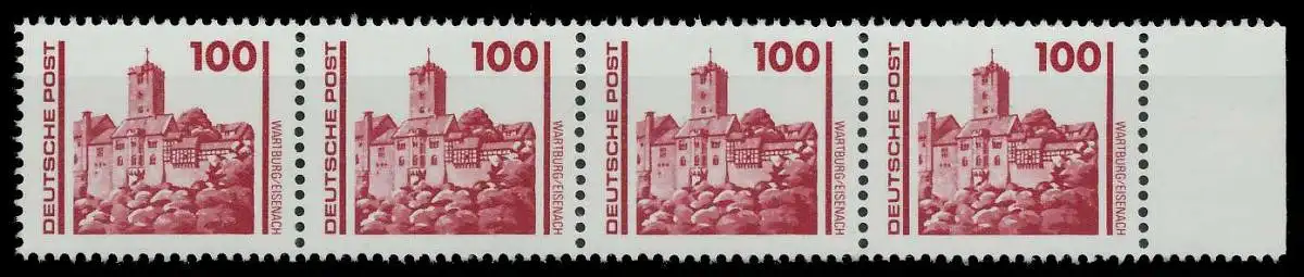 100 Pfg Wert aus der Freimarkenausgabe Bauwerke und Denkmäler, rechter Dachgiebel des hinteren Gebäudes rechts oben abgeschrägt, Feld 47 Teilauflage, waagerechter 4er Streifen vom rechten Seitenrand mit 3 normalen Marken