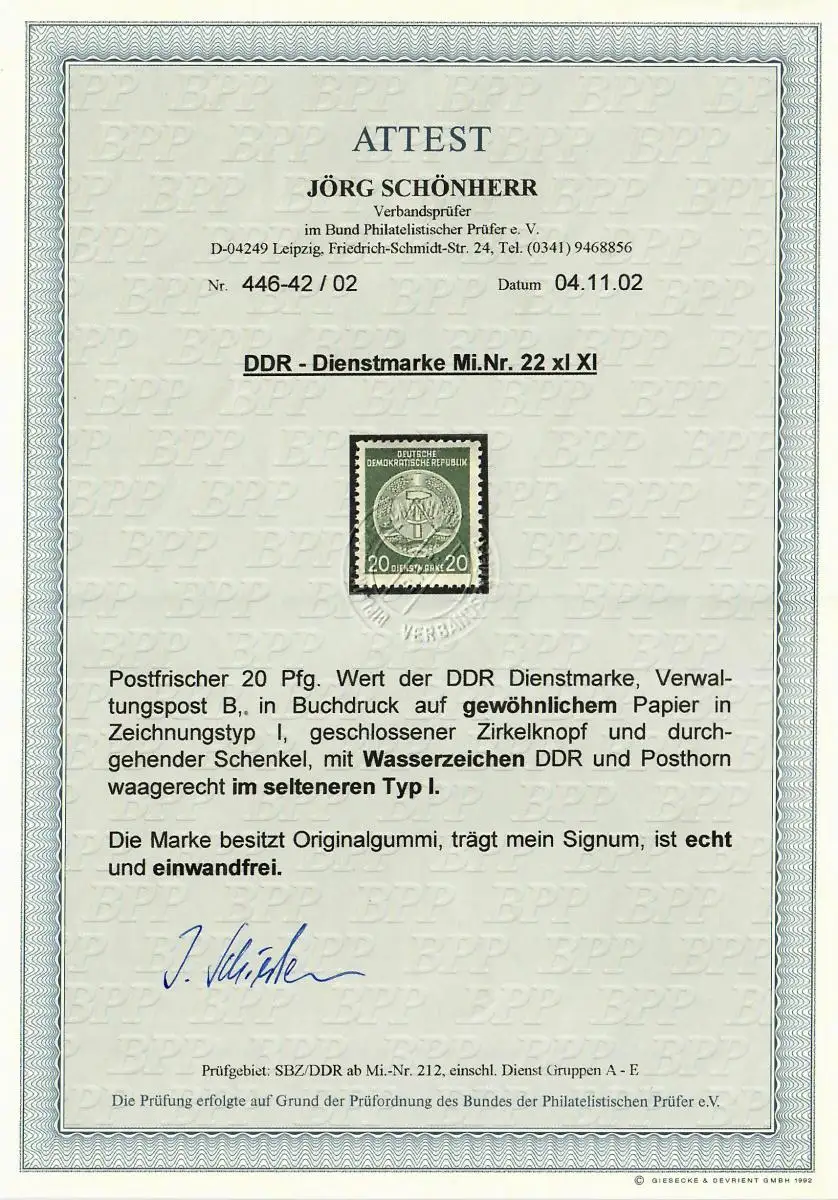 DDR Dienstmarke MiNr. 22 xl XI, Typ I, postfrisch, **, BPP Attest