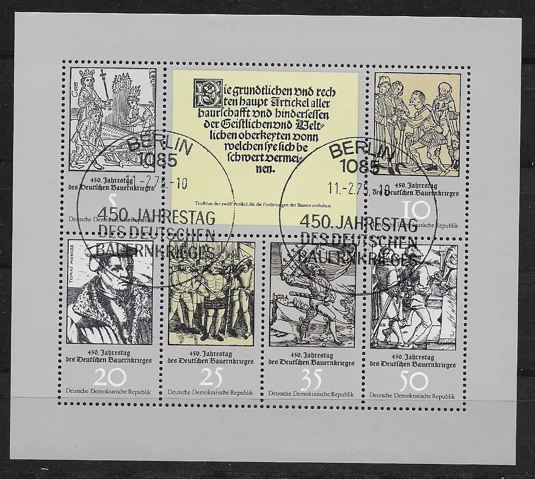 DDR: Kleinbogen mit MiNr. 2018 Plattenfehler I, gestempelt Berlin, Bauernkrieg