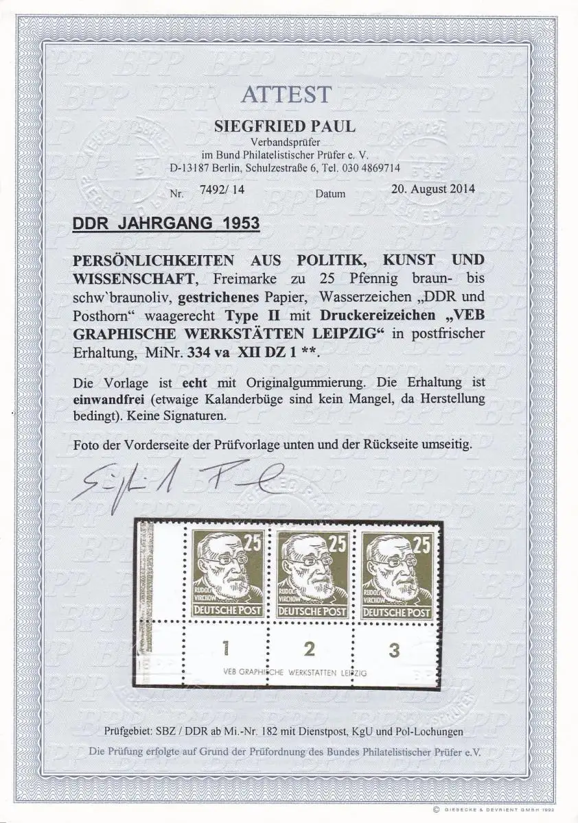DDR: MiNr. 334 va XII DZ 1, Eckrand 3er Streifen, Postfrisch **