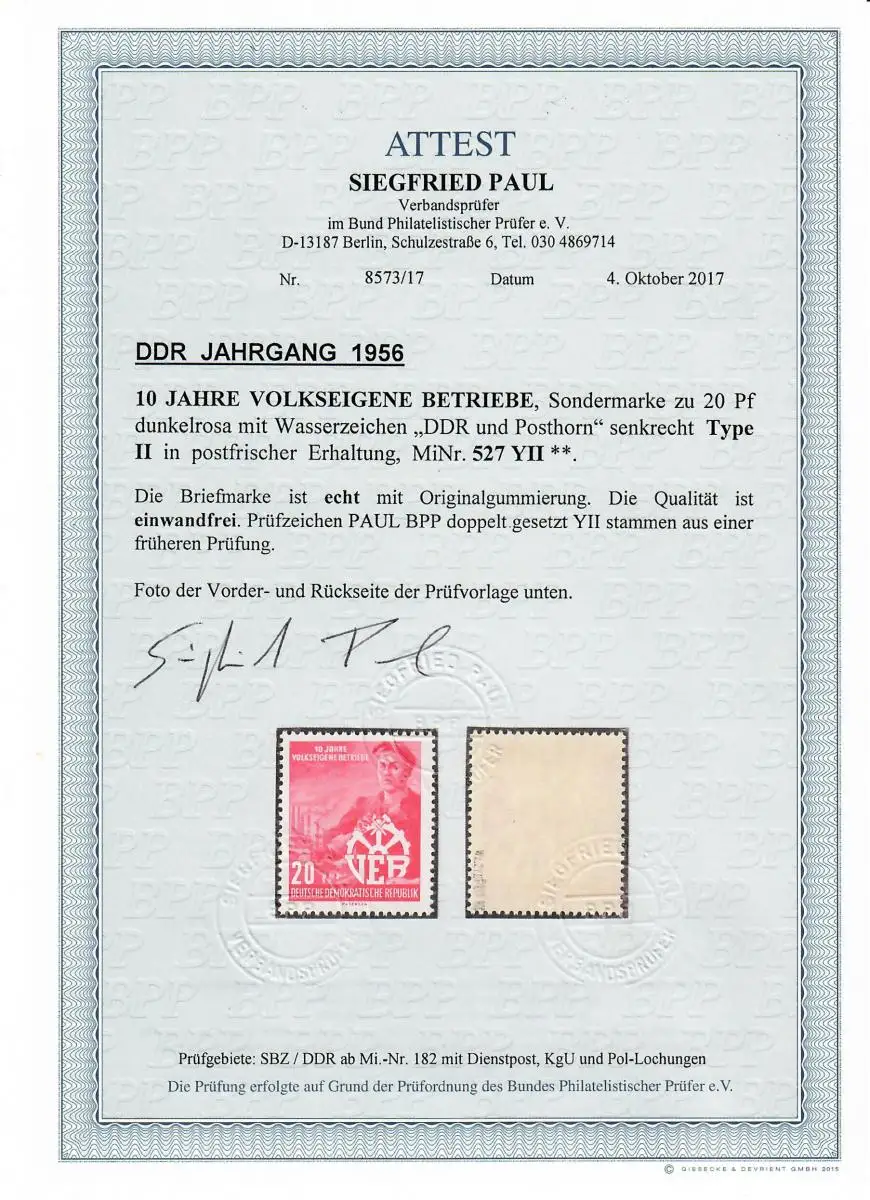 DDR: MiNr. 527 YII, postfrisch, **, Type II, BPP Attest