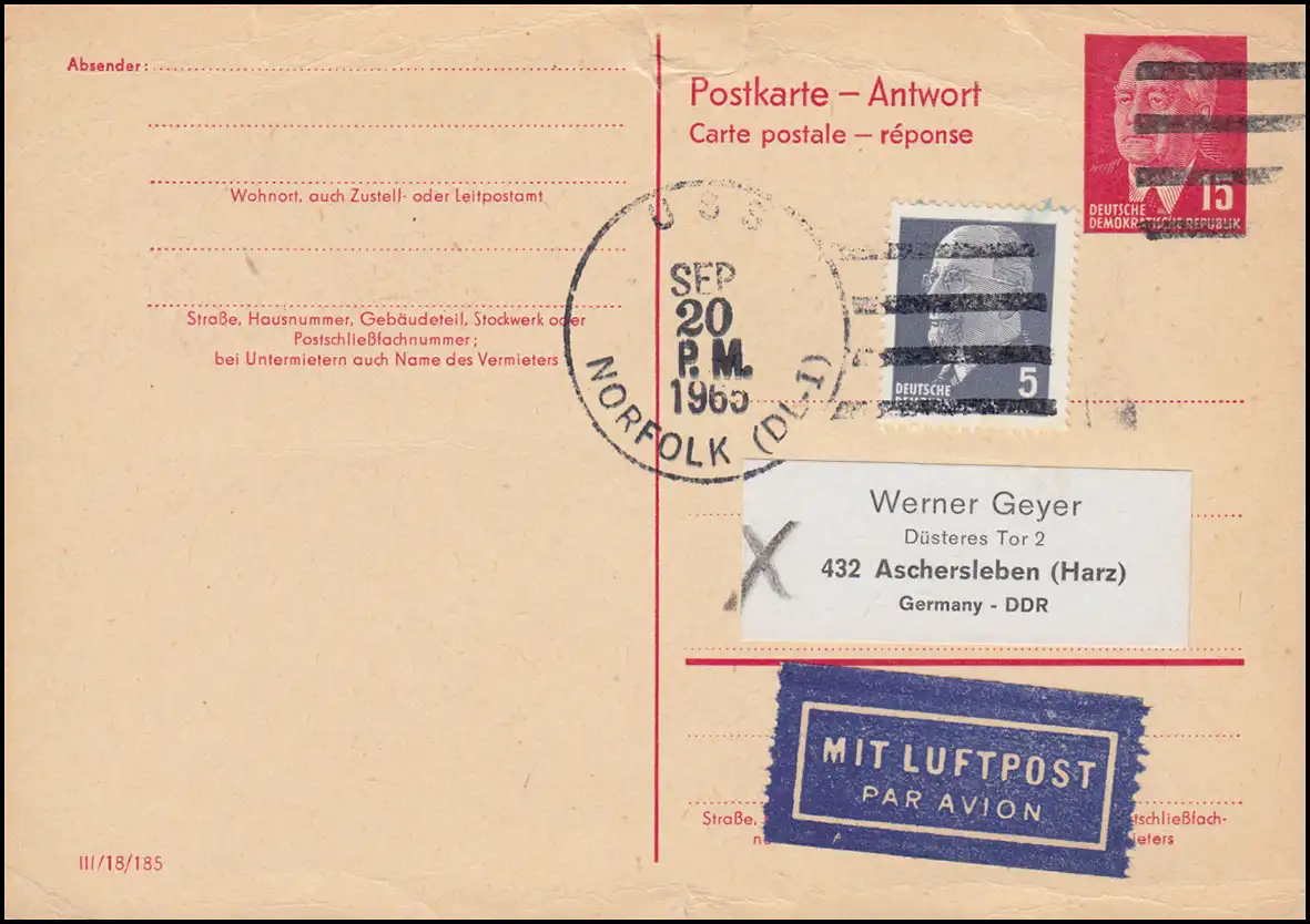 DDR P 65aA Pieck vom amerikanischen Kriegsschiff USS NORFOLK (DL-1) 20.9.1965