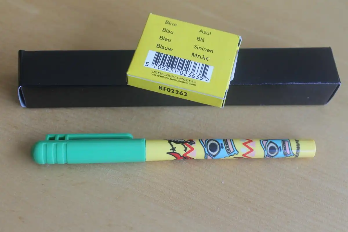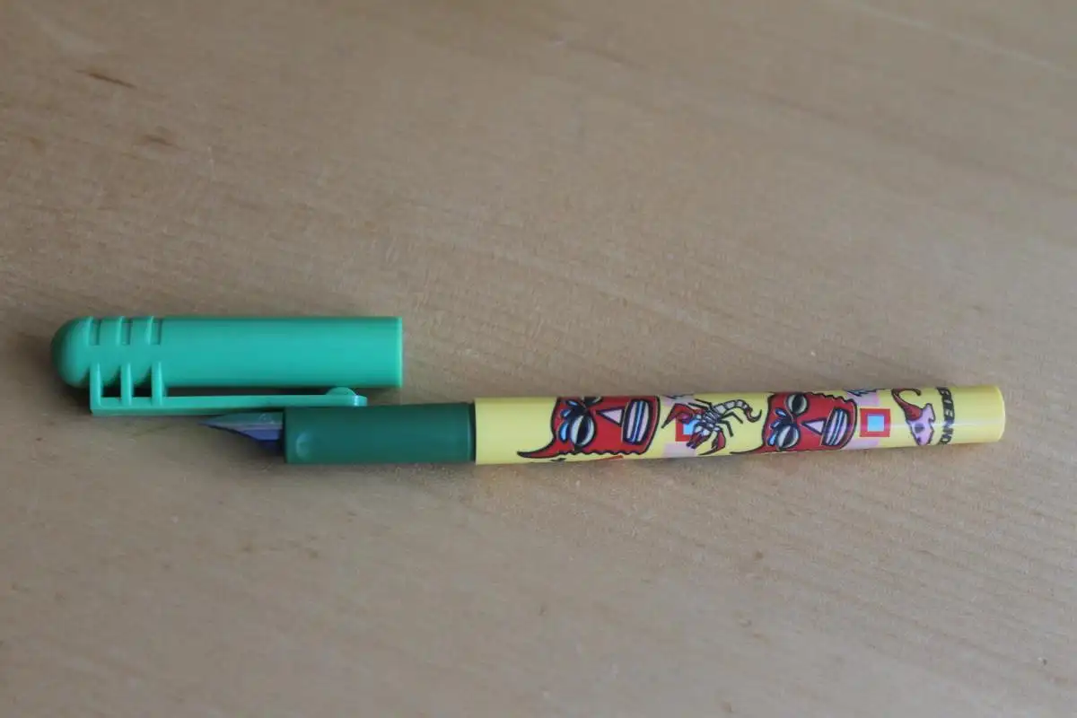 Design: gelb gemustert: Kappe grün; mit Anfängerfeder. Wurde von Schneider/Schwarzwald aus DDR-Produktion Wernigerode übernommen und kurze Zeit weiter produziert. Kann auch mit Pelikan-Patronen oder Konverter betrieben werden. Eine Schachtel Patronen (Blau; löschbar) wird mitgeliefert. FFH in OVP.