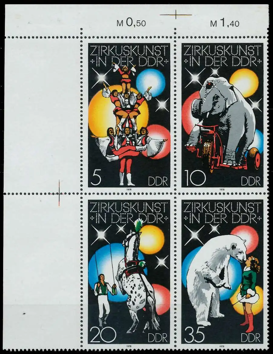 5 + 10 + 20 + 35 Wert aus der Ausgabe Zirkuskunst in der DDR Zusammendruck Viererblock (MichelNr.: 2364, 2365, 2366, 2367)