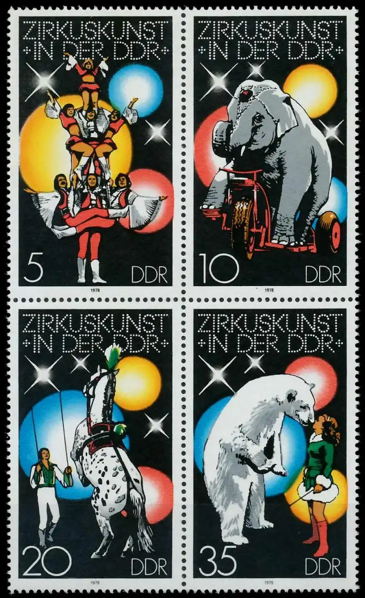 5 + 10 + 20 + 35 Wert aus der Ausgabe Zirkuskunst in der DDR Zusammendruck Viererblock (MichelNr.: 2364, 2365, 2366, 2367)
