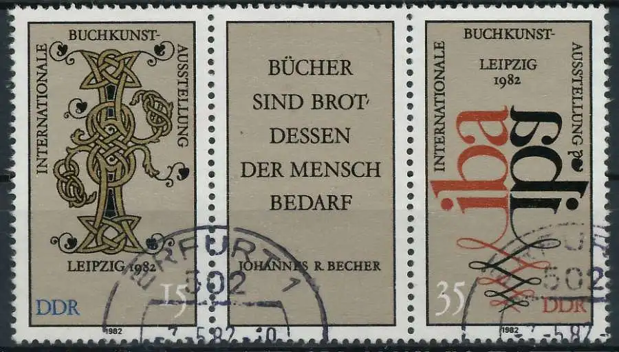 15 + ZF + 35 Wert aus der Ausgabe Internationale Buchkunstausstellung in Leipzig, Dreierstreifen (MichelNr.: 529, 2697, 2698)