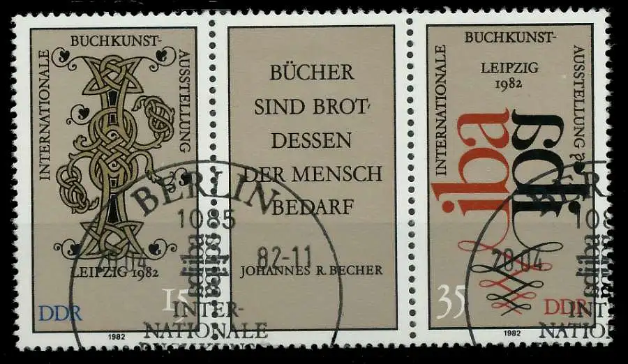 15 + ZF + 35 Wert aus der Ausgabe Internationale Buchkunstausstellung in Leipzig, Dreierstreifen (MichelNr.: 529, 2697, 2698)