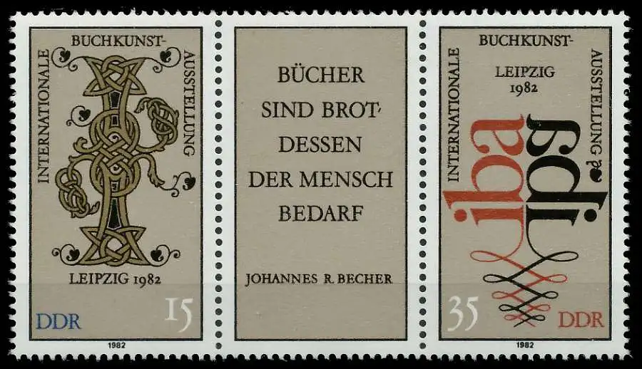 15 + ZF + 35 Wert aus der Ausgabe Internationale Buchkunstausstellung in Leipzig, Dreierstreifen (MichelNr.: 529, 2697, 2698)
