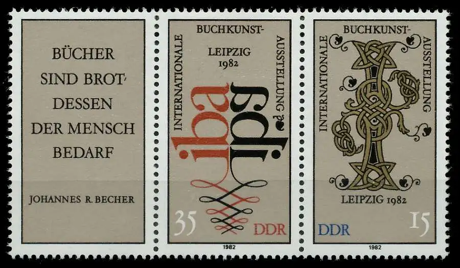 ZF + 35 + 15 Wert aus der Ausgabe Internationale Buchkunstausstellung in Leipzig, Dreierstreifen (MichelNr.: 531, 2697, 2698)