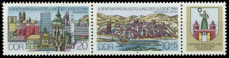 20 + 10 + ZF Zusammendruck aus der Ausgabe Briefmarkenausstellung der Jugend in Magdeburg 1984 (MichelNr.: 613, 2903, 2904)