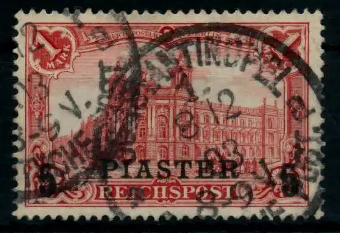 5 Piaster auf 1 Mark Wert aus der Ausgabe Freimarken Reichspostausgabe 1900 (Germania o. Wz.) mit waagrechtem schwarzem Aufdruck des Wertes in türkischer Währung, Aufdrucktype II