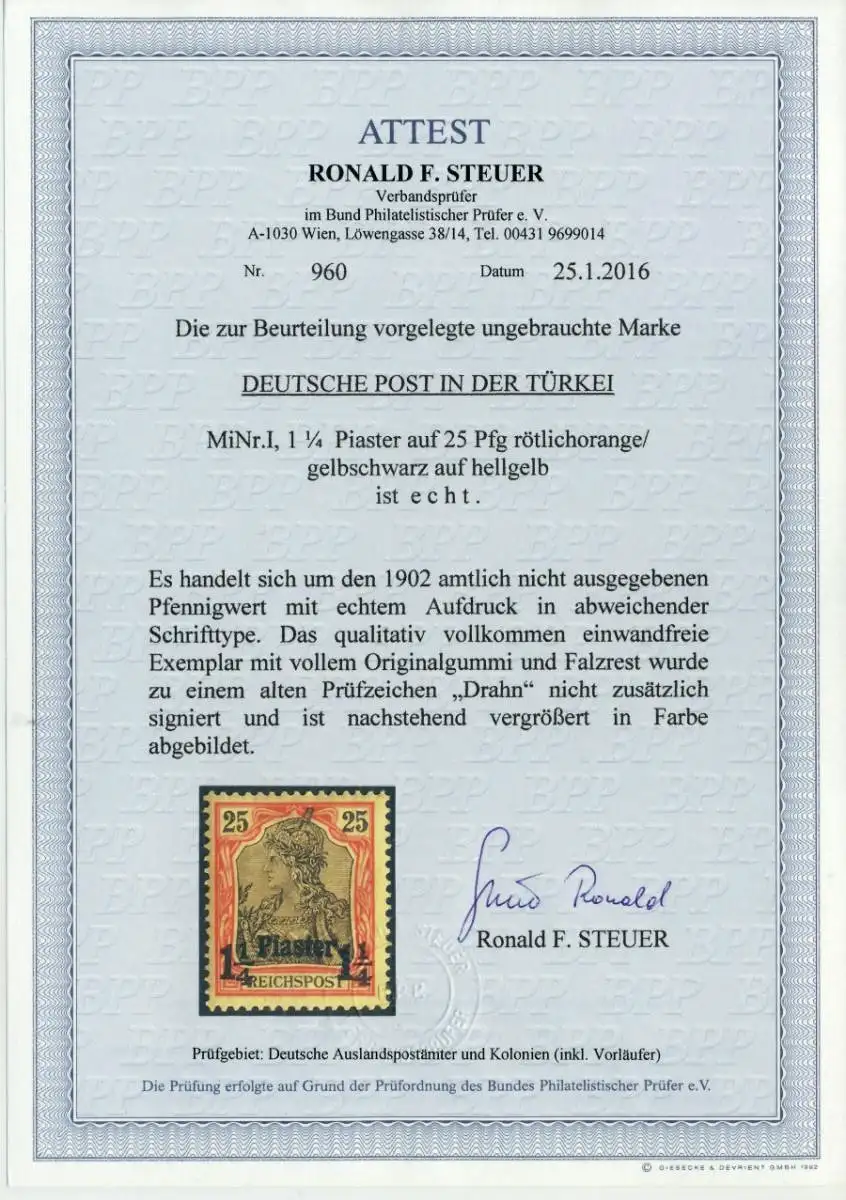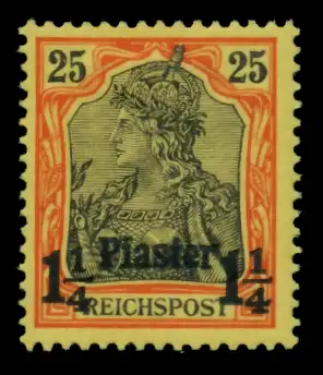 1 1/4 Piaster auf 25 Pfg Wert aus der Ausgabe Freimarken Reichspostausgabe 1900 (Germania o. Wz.) mit waagrechtem schwarzem Aufdruck des Wertes in türkischer Währung, nicht ausgegeben mit abweichender Aufdrucktype., mit aktuellem Fotoattest Steuer, einwandfrei