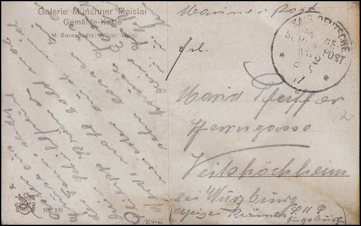 DEUTSCHE MARINE-SCHIFFSPOST No 2 - 8.9.1917 auf Feldpost-AK Gemälde Wilder Wein