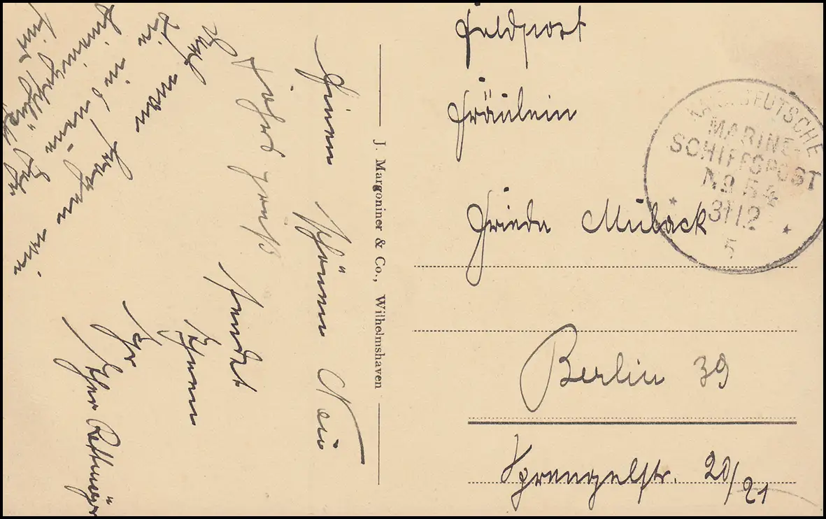Ansichtskarte "Wilhelmshaven Marktstraße" als Feldpost-Karte nach Berlin