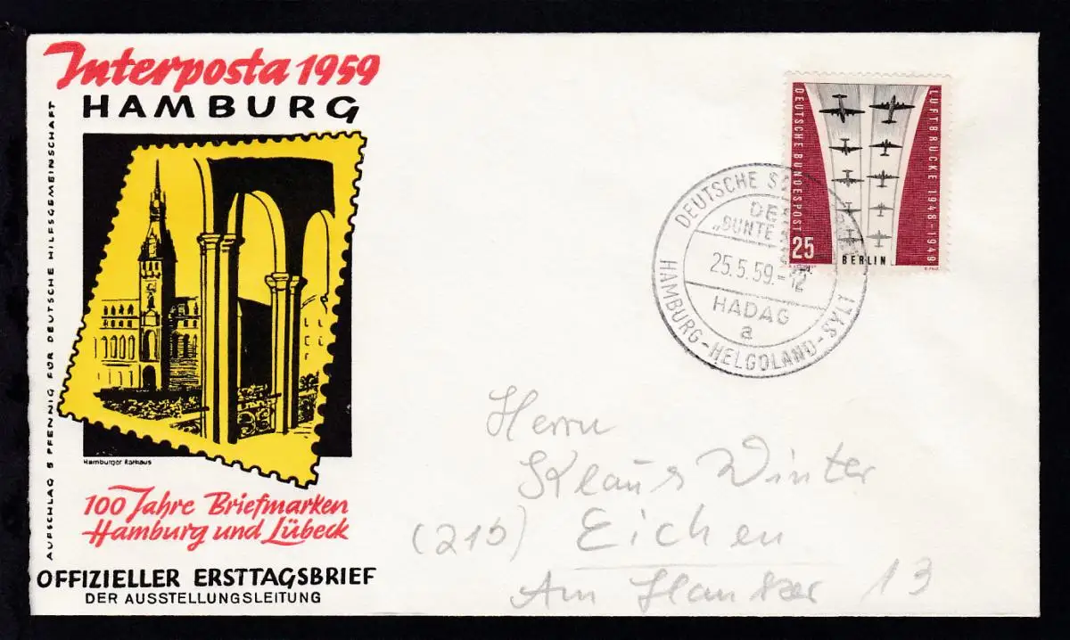 DEUTSCHE SCHIFFSPOST DES "BUNTE KUH" HADAG a HAMBURG-HELGOLAND-SYLT 22.5.59